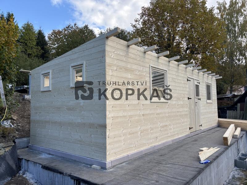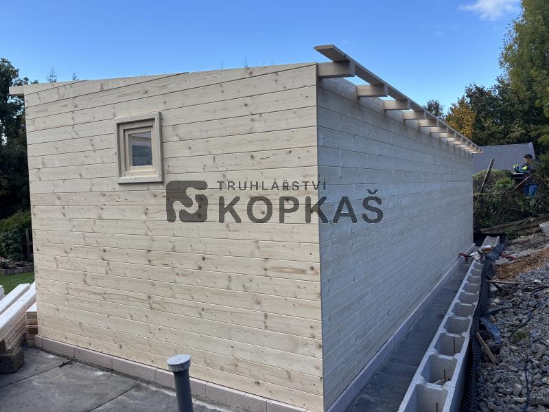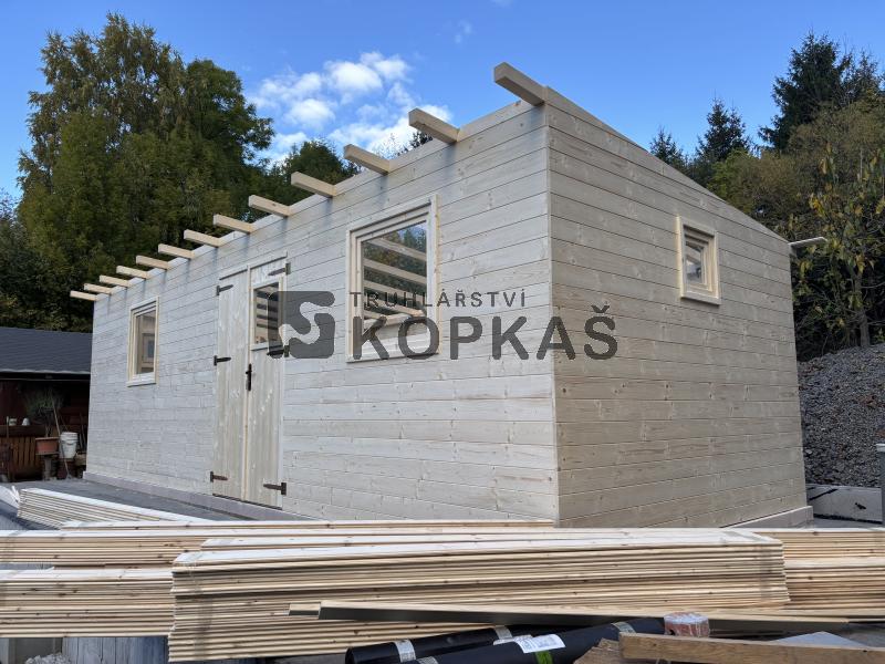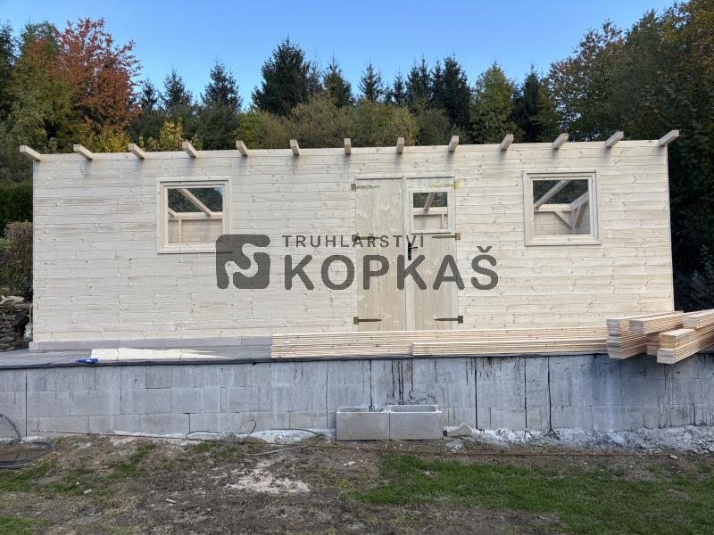 V ceně domku jsou palubky síly 1,9 cm na střechu domku a asfaltový pás.